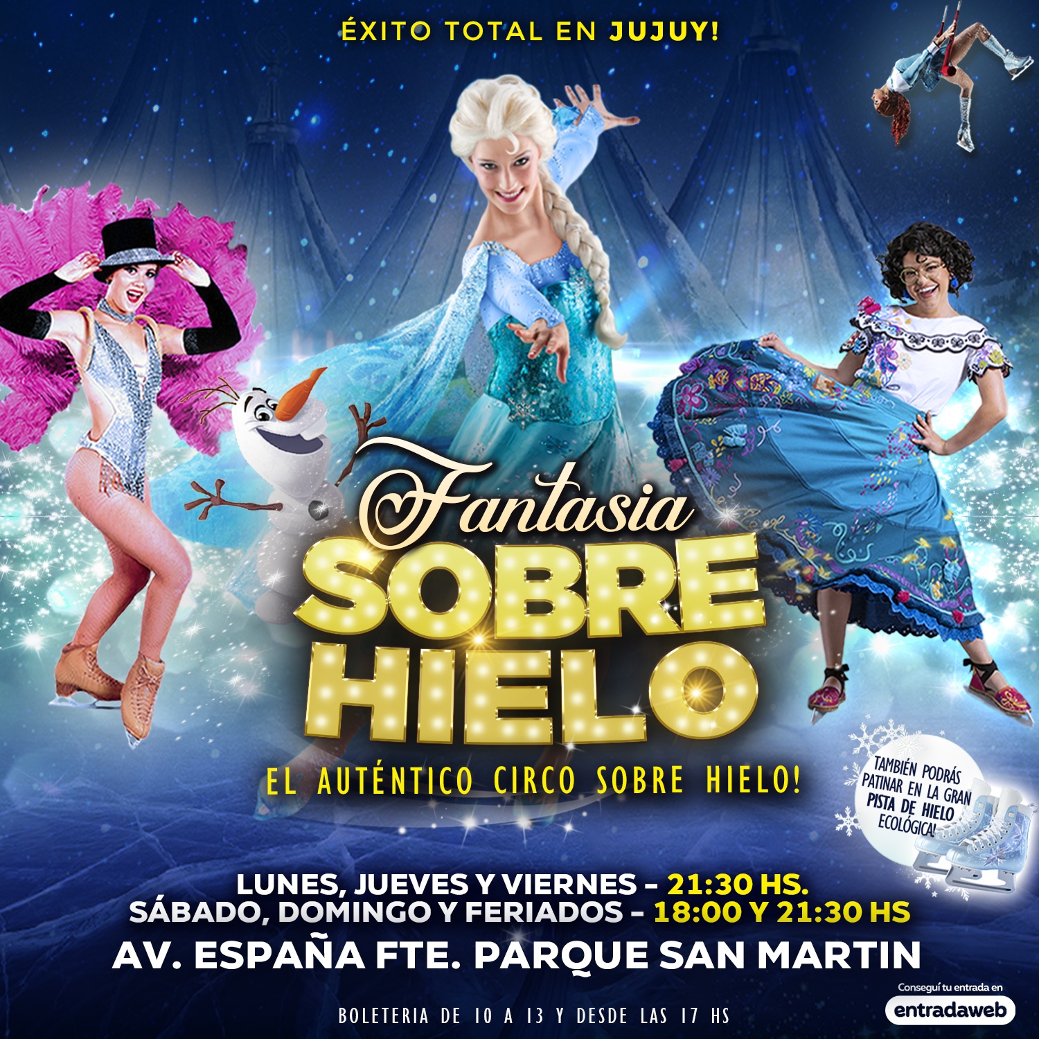 Con un elenco de más de 15 artistas en escena, este espectáculo promete cautivar a grandes y chicos con acróbatas, malabaristas, atracciones y audaces patinadores sobre hielo. Durante casi dos horas, el público puede sumergirse en un mundo de fantasía y emoción, donde escenografías y vestuarios increíbles se mezclan con efectos especiales, destacando la atracción principal: la pista de hielo ecológico. Además, el público podrá patinar en la pista de hielo ecológica en cada función, a partir de las 18 hs.
