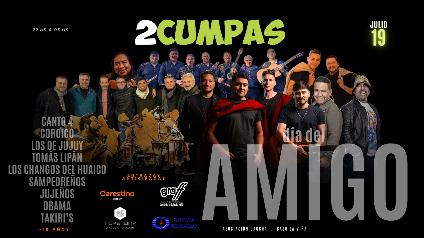 Será una noche pensada para homenajear la amistad. Las entradas disponibles en 2cumpas.com.ar; Alvear 627; Graff José de la Iglesia 1970 y Alvear 731, San Salvador de Jujuy.